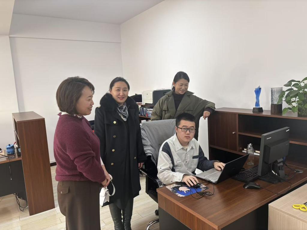 座谈结束后,在唐海岩总经理的陪同下,王植荔副教授和黄佳老师前往公司理赔部,实地考察了正在此处进行专业实习的2022级经济与金融专业学生刘佳琪的工作情况。走访团队与刘佳琪同学及他的实习指导老师进行了亲切交流,详细询问了他的工作内容、实习收获、遇到的困难以及在企业的适应情况。