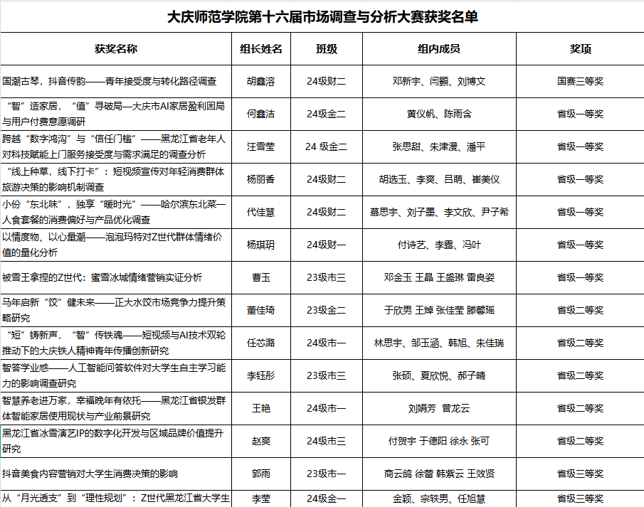 2026年4月28日,“正大杯”第16届全国大学生市场调查与分析大赛黑龙江省赛获奖名单正式公布。球友会体育学子在此次大赛中表现优异,荣获国家级三等奖1项、省级一等奖6项、省级二等奖5项、省级三等奖2项,创下参赛以来的学院历史最好成绩。